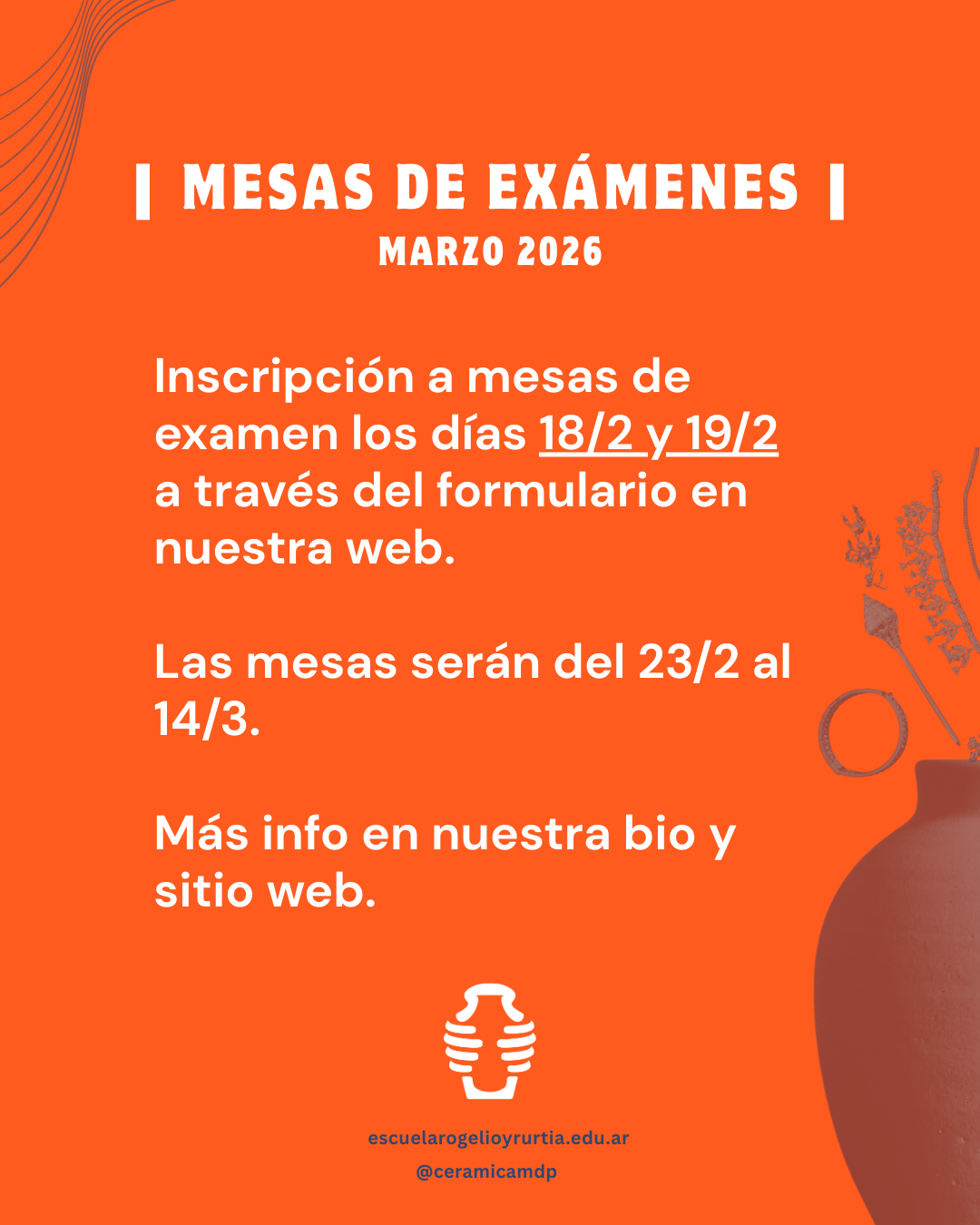 INSCRIPCIÓN A MESAS DE EXÁMENES Autor de la entrada:Escuela de Ceramica Publicación de la entrada:13/02/2026 Categoría de la entrada:Llamado a mesas / Novedades Se abre la inscripción para el 1er llamado a mesas de examen del mes de Marzo. La inscripción se realizará del 18 al 19 de febrero, y las mesas serán del 23 de febrero al 14 de marzo. Formulario para inscribirse: aquí Link para ver las mesas: aquí También podría gustarte INSCRIBITE EN NUESTRAS CARRERAS! 28/02/2025 INAUGURACIÓN DEL MURAL EN BIBLIOTECA LUGONES 28/10/2021 INSCRIPCIÓN MESAS EXTRAORDINARIAS 05/05/2025