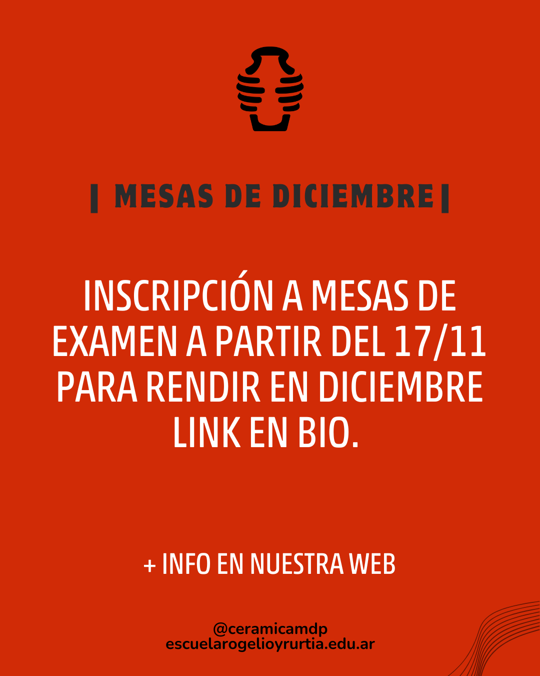 INSCRIPCIÓN MESAS DE EXÁMENES DICIEMBRE Autor de la entrada:Escuela de Ceramica Publicación de la entrada:14/11/2025 Categoría de la entrada:Llamado a mesas / Novedades Inscripción a partir del 17/11 hasta el 22/11 a las 18h sin excepción. Link del formulario: aquí Ver mesas: aquí Las mesas se desarrollarán del 01 al 20 de diciembre. También podría gustarte LLAMADO A LICITACIÓN BUFFET, KIOSKO, FOTOCOPIADORA Y LIBRERÍA 12/05/2025 CAMPUS / BASE DE DATOS 2025 21/03/2025 RIFA SOLIDARIA COOPERADORA 04/04/2025